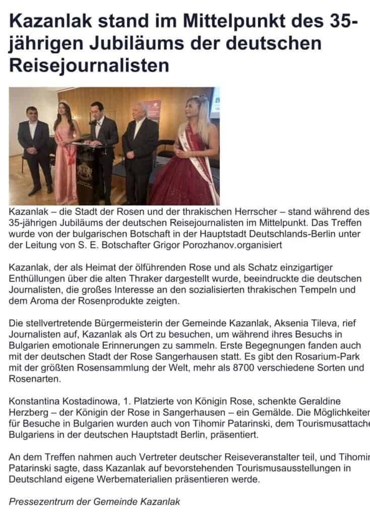 „Das Jubiläumsevent ‚Touristischer Branchentreff – Im Zeichen der Rose‘ war ein großer Erfolg. Es brachte internationale Gäste aus Medien, Tourismusbranche und Institutionen zusammen und hat den Reichtum der bulgarischen Traditionen sowie das moderne touristische Potenzial unseres Landes eindrucksvoll gezeigt. Solche Veranstaltungen sind wichtig für die Vertiefung der bilateralen Partnerschaft zwischen Bulgarien und Deutschland im Bereich Tourismus, Kultur und professioneller Austausch.“
