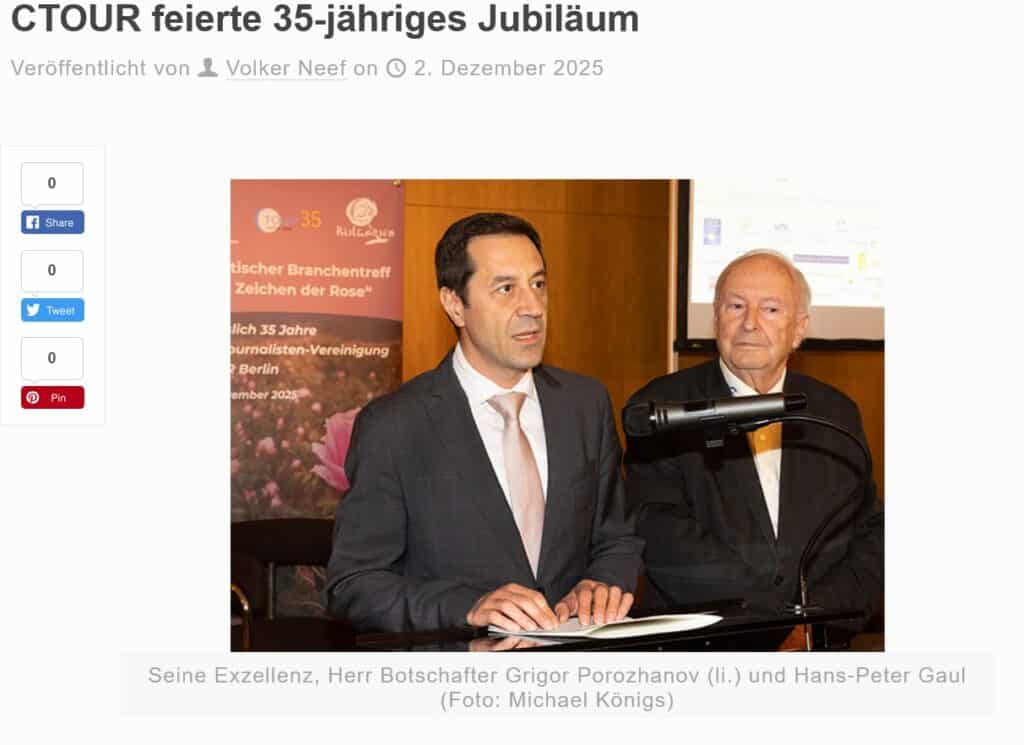 Für die Idee, Programmgestaltung und Organisation des „Touristischen Branchentreffs“ 2025 in Regie des CTOUR-Ehrenpräsidenten Hans-Peter Gaul und des 1. Sekretärs der Bulgarischen Botschaft Dr. Tihomir Patarinski gab’s ein vielfältiges Echo.
