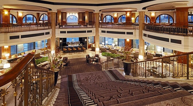 Die einzigartige Hotelhalle des Westin Grand Hotel mit ihren sechs säulengetragenen Etagen und der imposanten Freitreppe im Erdgeschoss ziehen immer wieder die Blicke auf sich. Von hier aus erreichen die Gäste wie vor einhundert Jahren in der Kaisergalerie nun die Restaurants, Salons und Zimmer.