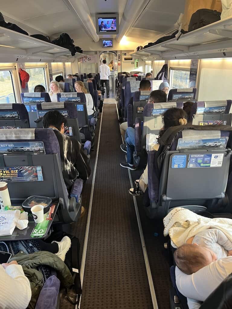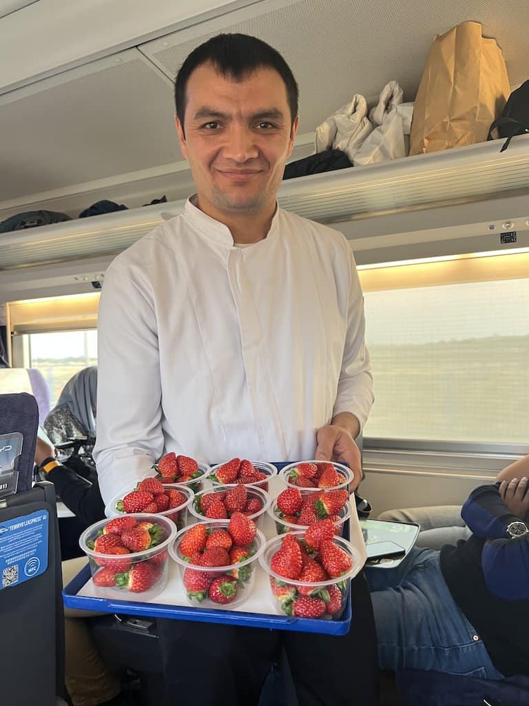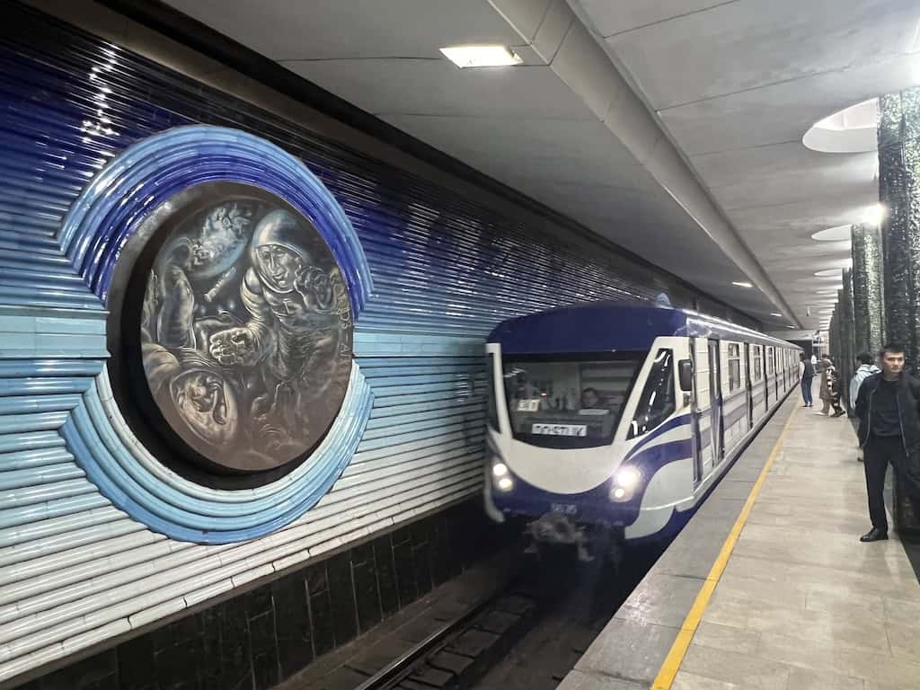 Am nächsten Morgen stehen wir am Hauptbahnhof von Taschkent. Heute geht es mit dem Hochgeschwindigkeitszug Afrosyb und bis zu 230 km/h durch die Wüste nach Samarkand. Der spanische Talgo-Zug bietet drei Klassen: VIP, Business, Economy. Die zweistündige Fahrt über 300 Kilometer kostet nur 10 Euro. Dabei werden jedem Reisenden noch ein Imbiss und ein Kaffee/Tee kostenlos gereicht. Bei solchen Tarifen und kurzen Reisezeiten ist jeder Platz belegt, zumal nur je zwei Züge vormittags und nachmittags fahren. Rechtzeitige Reservierung ist ein Muss!