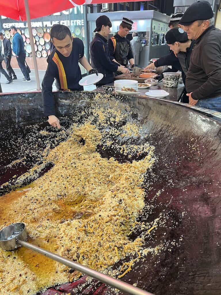 Als Nationalgericht in Usbekistan gilt Plov: Es wird traditionell aus langkörnigem Reis, Zwiebeln, Brühe und Hammelfleisch zubereitet. Manchmal werden auch Möhren, Erbsen und/oder Rosinen verwendet. Jede Region schwört auf ihr Rezept. Das Erfolgskonzept besteht aus Braten, Kochen und Garen in riesigen Kesseln – für 50 und mehr Personen.