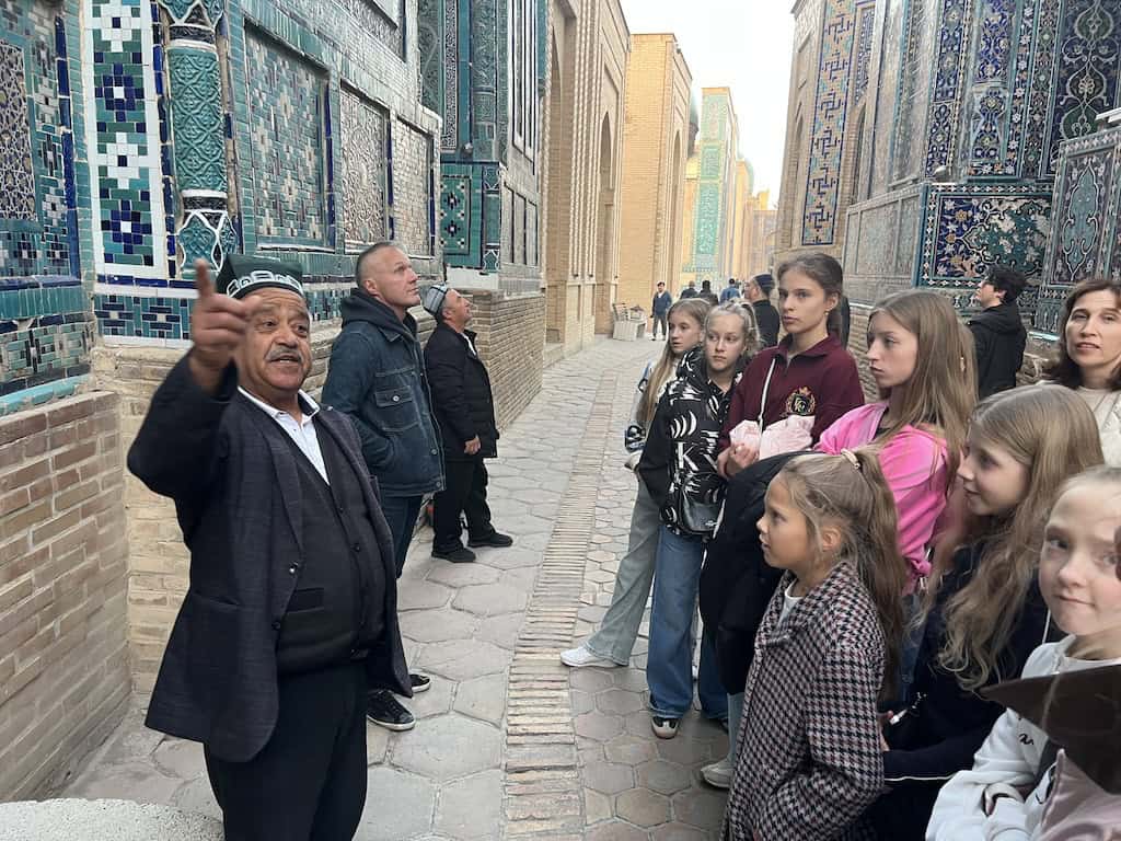 Samarkand ist eine der ältesten Städte der Welt, ungefähr 2500 Jahre. Es ist ein Schmelztiegel der Völker: Tadschiken, Iraner, Usbeken, Kasachen, Russen, Türken, leben hier. 70 Prozent der Einwohner Samarkands sind originär Tadschiken. Einschließlich chinesisch und russisch empfängt uns überall in der Stadt ein buntes Sprachgemisch.