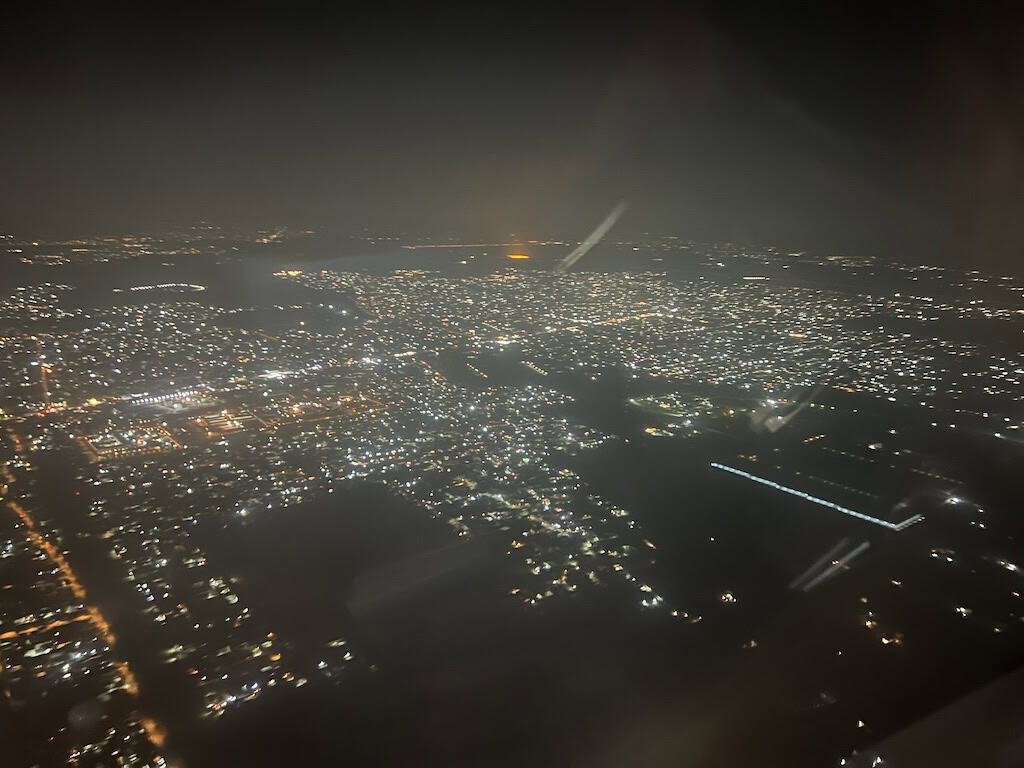 1 Uhr nachts spektakulärer Anflug auf das hell erleuchtete Taschkent (Strompreis 2 Cent/KWh).
