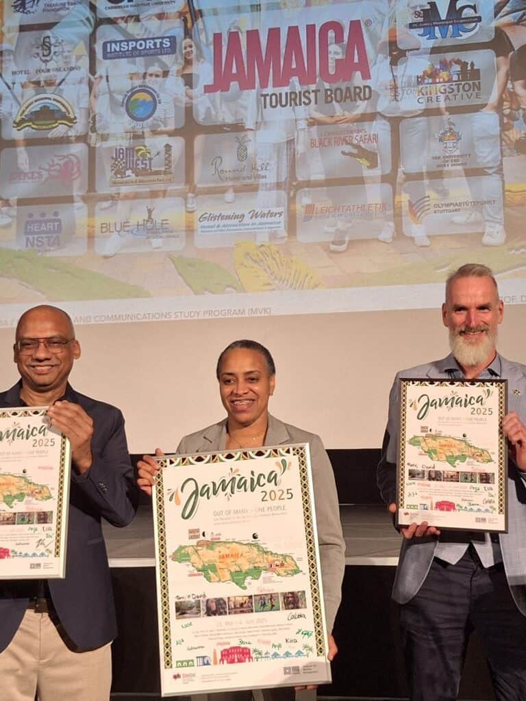 rechts: Ehrung zur Jamaika-Filmpremiere: Gregory Shervington, Jamaika Tourist Board, Regional Director Continental Europe, Laura Anne McNeil, Botschaft Jamaika, Gesandte (Geschäftsträgerin a.i.) und Frank Grafenstein, Jamaika Tourist Board, PR Deutschland Österreich und Schweiz (v. l.)