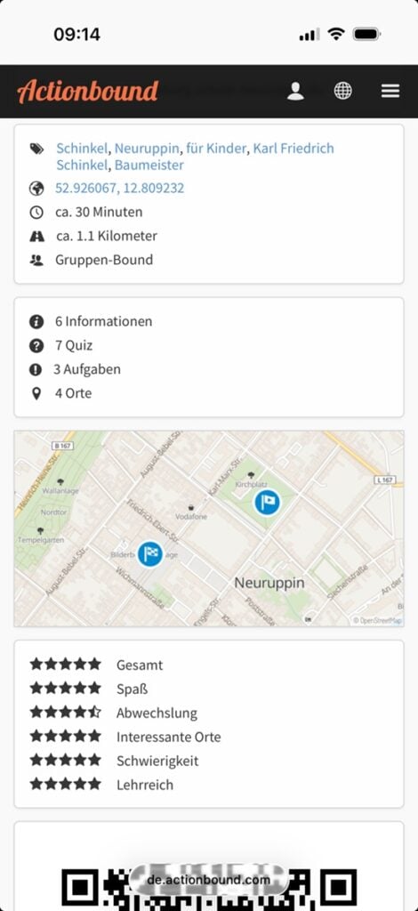 Dazu wurde mit Hilfe der Plattform „Actionbound“ eine interaktive Bildungsroute durch Neuruppin gestaltet, quasi eine Schnitzeljagd, und mit Informationen, Quiz und spielerischen Aufgaben versehen.