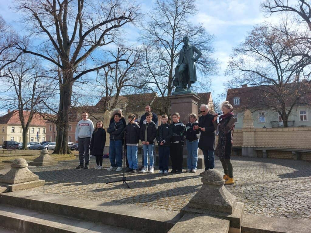 Der Countdown bis zum 13. März 2031 läuft und dazu haben sich an diesem Vormittag zwei Schülergruppen der Rosa-Luxemburg-Schule aus Neuruppin mit ihren Lehrern und einigen Gästen beim Schinkel-Denkmal versammelt. Aus den Reihen der Schüler wurde ein Team der „Stadtentdecker“ aufgestellt, die hier ihren großen Schinkel-Geburtstags-Check vorstellten.
