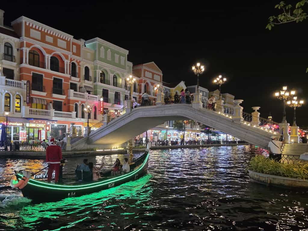 Aus europäischer Sicht etwas bizarr wird es im so genannten Grand Garden. Hier gibt es eine phantasiereiche Stadtlandschaft a la Venedig samt großem Kanal und einem „See der Liebe“. Mehrere Brücken und eine Kopie des Markusturms dürfen auch nicht fehlen. Die musikalische Untermalung zum abendlichen farbigen Spiel der Fontänen läßt sich mit „Rondo Veneziano meets Kitaro“ charakterisieren. „Venedig“ ist gut besucht. Die vorrangig aus Asien stammenden Touristen lieben es. Die Restaurants mit lokaler, koreanischer, indischer, russischer, usbekischer und mongolischer Küche sind abends voll. Pizza und Spaghetti sind aber „stilecht“ auch im Angebot. Fürs Gondelfahren muss man Schlange stehen.