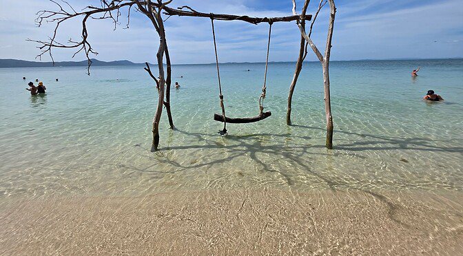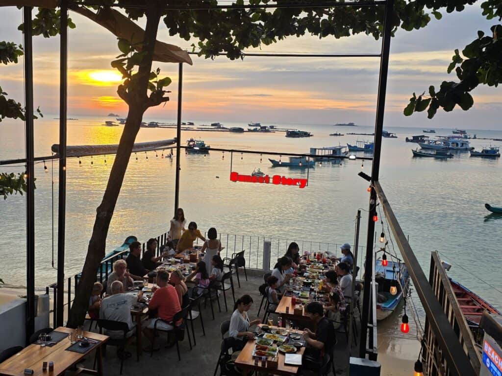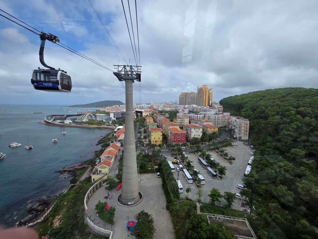Es soll die längste Seilbahn der Welt über dem offenen Meer sein. Man schwebt mit einem fantastischen Ausblick knapp 20 Minuten über zwei kleine Inseln zur Insel Hon Thom, wo gerade ein weiterer, teilweise