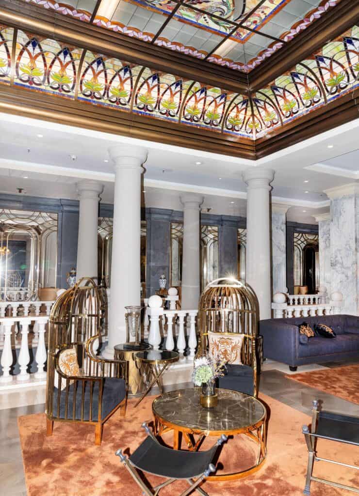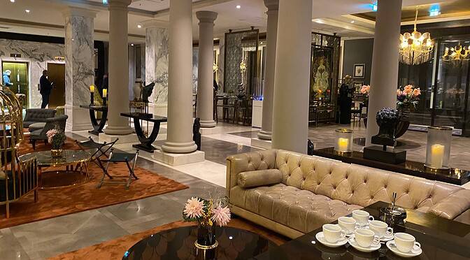 Weiße Säulen, edle Teppiche, vergoldete Spiegel, glänzende Lüster, bequeme Sitzmöbel, opulente Blumengestecke – alles wirkt sehr luxuriös.